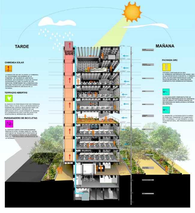 El mecanismo funciona de este modo: una chimenea solar conecta todas las plantas de oficinas. El aire interior es calentado por los ocupantes y las computadoras en uso, y se eleva de forma natural por la chimenea. Conforme se escapa este aire caliente en la parte superior, el aire fresco es aspirado desde las ventanas y hacia el interior del inmueble.