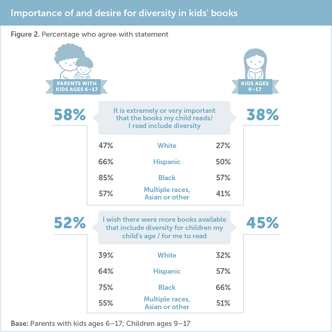 Según Scholastic, aproximadamente 6 de cada 10 padres (58%) informan que la diversidad es extremadamente importante en los libros que lee su hijo, y casi 4 de cada 10 niños de 9 a 17 años (38%) está de acuerdo.