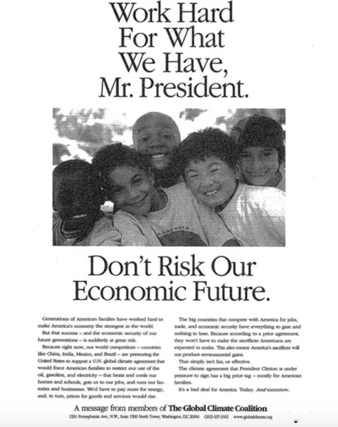 Este grupo fungió como una tapadera para las empresas de servicios públicos, petróleo, carbón, minería, ferrocarriles y automóviles; además apuntó a las negociaciones de Kioto y fue parte de una campaña de 13MDD, con un éxito tal que la Casa Blanca le dijo a GCC: El presidente Bush “rechazó Kioto, en parte, basándose en sus aportes”.
