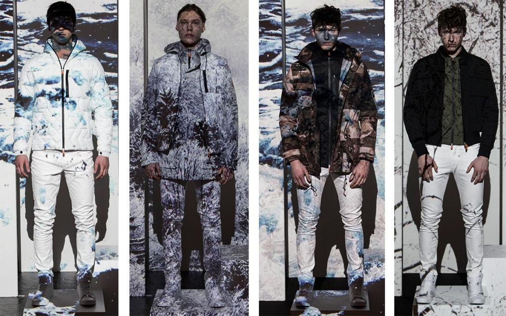 En una de sus colecciones recientes presentada en la Semana de la Moda de Londres, usó trajes protectores de inmersión para crear abrigos de hombre y mujer.
