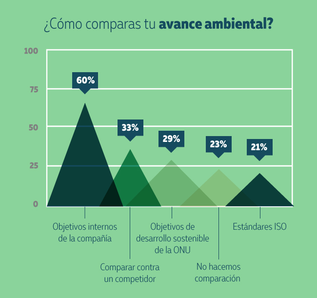 Solo el 21% identificó las normas ISO como punto de referencia, mientras que el 29% utiliza los Objetivos de Desarrollo Sostenible (ODS) de la ONU. El benchmarking contra competidores fue favorecido por un tercio de los encuestados. El enfoque preferido fue el punto de referencia contra los objetivos internos.