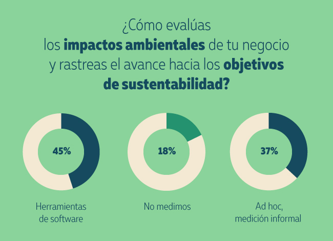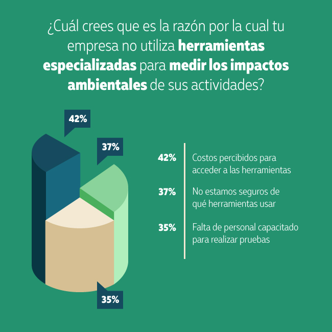 A pesar de que las empresas citan un fuerte compromiso con la sostenibilidad, la encuesta revela una imagen diferente. Esto se evidenció por la falta de recursos internos a tiempo completo y la dependencia de actividades adecuadas. Más de un tercio de los encuestados afirmó que la falta de personal capacitado (35%) o conocimiento (37%) fue la razón por la cual su empresa no utilizó herramientas especializadas para medir los impactos ambientales. El 42% afirmó que el costo percibido para acceder a dichas herramientas era una barrera.