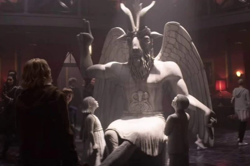 Sin embargo, dentro de la escenografía que se comparte en la primera temporada, y justo en la escuela de “Las artes oscuras”, podemos observar una curiosa estatua que hace referencia al “Señor Oscuro”, mejor conocido como “Satán”, -para algunos-, y a pesar de que la figura trasmitía originalidad, al parecer los creadores de la serie la plagiaron de un Templo Satánico.