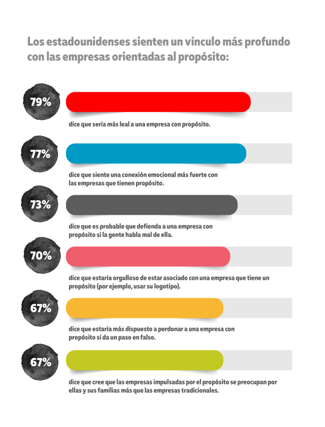 - El propósito es más que solo una tendencia: es la nueva norma. Los estadounidenses esperan que a las empresas no les importe solo ganar dinero, sino dejar un impacto positivo en la sociedad. Las empresas necesitan identificar, comunicar y vivir el propósito para mantener la relevancia, la confianza y la ventaja competitiva.