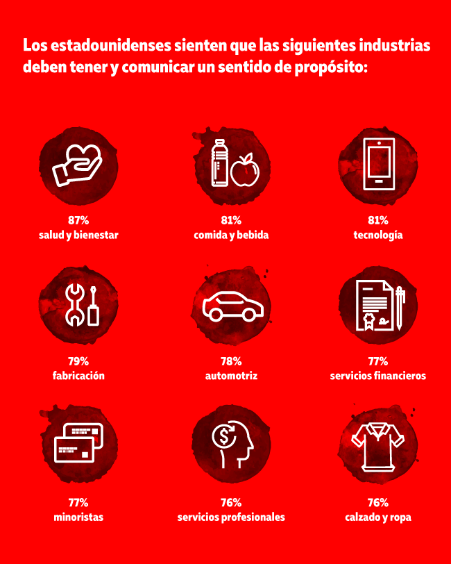 - Ninguna industria se puede salvar. Los estadounidenses creen que el propósito es una expectativa en todas las industrias, desde el cuidado de la salud hasta la manufactura. Las empresas necesitan hacer una introspección para asegurar que su articulación de propósito sea auténtica.