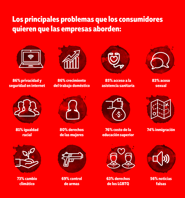 - Ningún problema está fuera de los límites. Los estadounidenses esperan que las compañías resuelvan problemas importantes desde la privacidad y la seguridad del internet hasta el control de armas. Pero eso no significa que una empresa se involucre en cada problema que surja: tienen que usar el propósito como objetivo para determinar qué problemas defender y cómo.