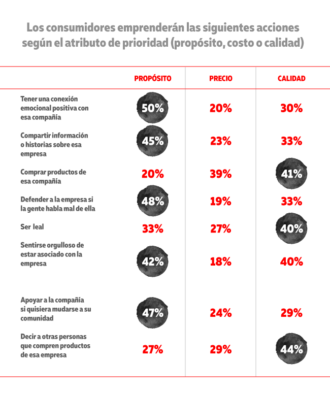 El propósito es tan importante como el precio y la calidad a la hora de compartir información o historias sobre esa empresa (45%) y el orgullo de estar asociado con esa compañía (42%). Sin embargo, los compradores todavía ven la importancia de los productos de alta calidad. La calidad supera el propósito y los precios en términos de lealtad (40%), compra (41%) y decirle a otros que compren un producto (44%).
