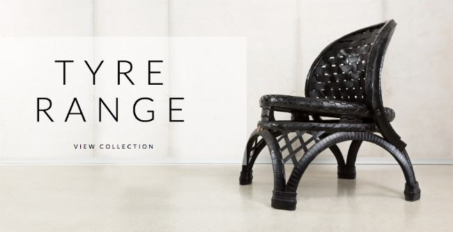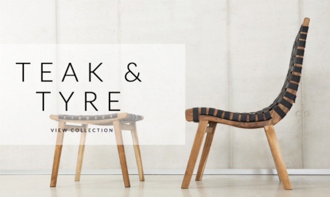 Los diseños simples pero distintivos combinan los dos materiales muy duraderos, madera de teca y neumáticos viejos, en piezas cómodas y atractivas, gracias a la flexibilidad del caucho y una apariencia que podría confundirse con el cuero negro.