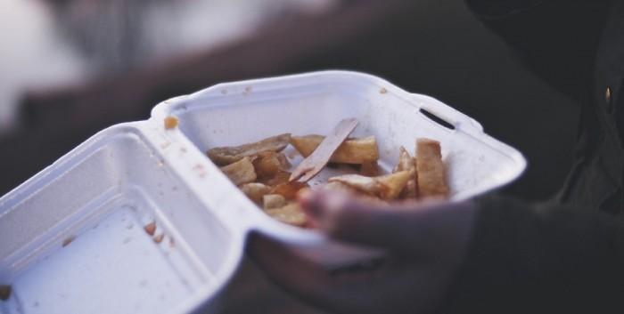 El poliestireno se puede encontrar en vasos térmicos, bandejas de comida para llevar y relleno para embalaje. Se trata de un material blanco con textura suave. Es altamente contaminante, incluso puede ser tóxico si se utiliza para productos alimenticios, por lo que es conveniente siempre pedir alimentos para llevar en tuppers.