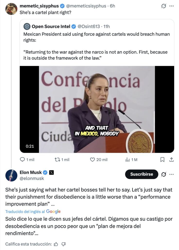 Fue tras esa postura pública cuando el empresario Elon Musk respondió en la red social X afirmando que la mandataria “solo dice lo que sus jefes del cártel le dicen que diga”, agregando además un comentario irónico sobre las consecuencias de desobedecerlos. El mensaje se viralizó rápidamente y detonó el conflicto mediático.