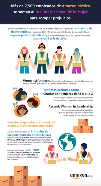 Bajo su compromiso de impulsar una cultura de diversidad, equidad e inclusión, Amazon firmó en 2021 los Principios de Empoderamiento de las Mujeres, establecidos por el Pacto Mundial de las Naciones Unidas y ONU Mujeres. “Esto refleja nuestra misión de ser el mejor lugar para trabajar de la Tierra, comprometidos a promover la equidad de género y el empoderamiento de las mujeres en el lugar de trabajo, el mercado y la comunidad” señaló Hector Alexandre, Líder de Recursos Humanos de Amazon México Operaciones.