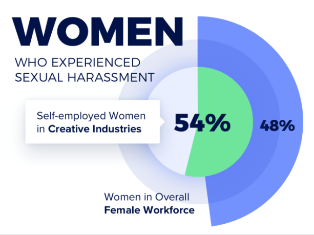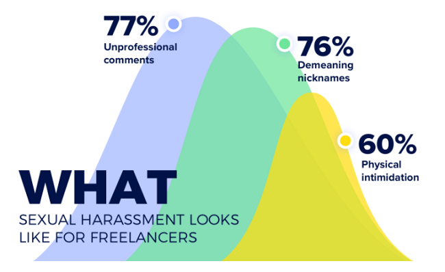Los números de empleados freelance y acoso sexual en el informe de HoneyBook son altísimos. El 54% de los freelancers reportó haber sido acosado sexualmente en el curso de su trabajo. De este número, el 77% ha recibido “comentarios poco profesionales” sobre su apariencia, tres cuartas partes de ellos fueron llamados con “apodos degradantes” en el trabajo, y un 60% informó intimidación física.