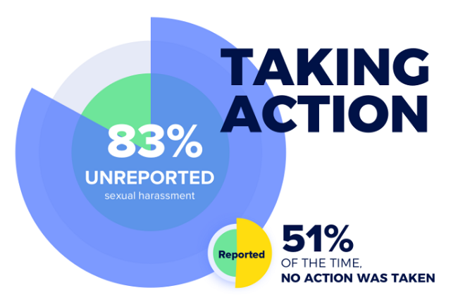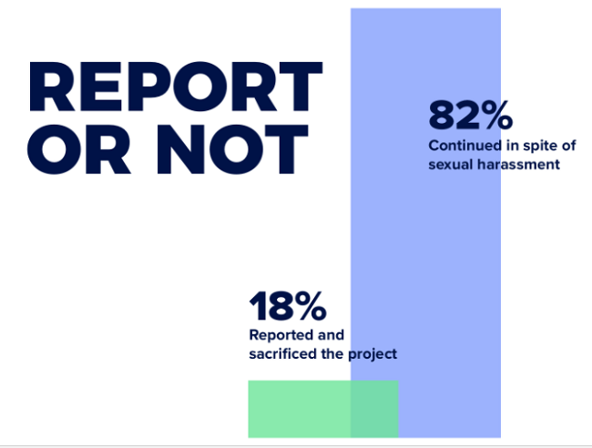 El 87% nunca trajo estos incidentes a la atención de nadie, a pesar de que el 18% dice que fue acosado por la misma persona más de cuatro veces. De hecho, más del 80% continuó trabajando en el proyecto donde sufrió acoso sexual. Aquellos que sí presentaron denuncias encontraron que sus reclamos fueron ignorados más de la mitad de las veces.