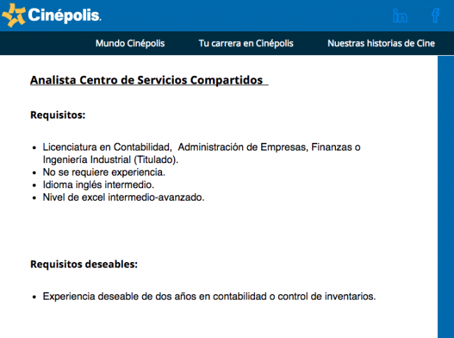 Esta mala práctica habla de una empresa que no ha evolucionado, que tiene preferencias banales y que no es responsable, al menos no en su proceso de contratación. Busca vacantes que no estén determinadas por el sexo de la persona y que mandar fotografía no sea indispensable, como ejemplo una de las más recientes vacantes de Cinépolis.