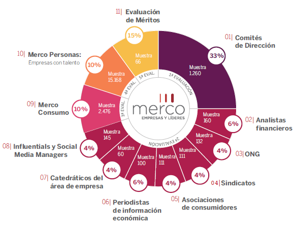 Para reconocer y evaluar toda esta labor, Merco (Monitor Empresarial de Reputación Corporativa), examina las iniciativas y comportamiento de las empresas por medio de una series de metodologías compuestas aproximadamente por cinco evaluaciones y doce fuentes de información.