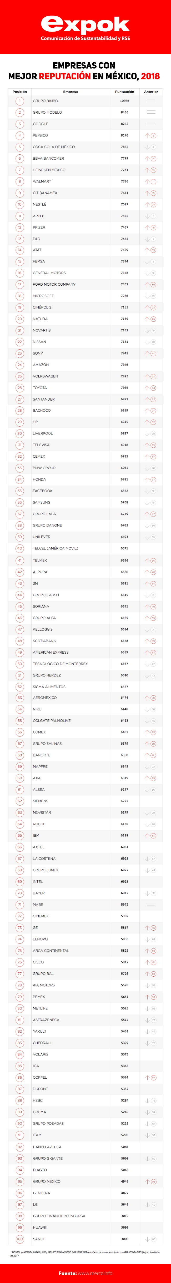 Para la edición número 18, MERCO, resaltó a las empresas con mejor reputación en México colocando a Grupo Bimbo, Grupo Modelo, Google, Pepsico y Coca Cola de México entre las primeras cinco. También resaltaron a Daniel Servitje (Grupo Bimbo) y en 2ª y 3ª posición María Teresa Arnal (Google) y Jose Antonio Fernández Carbajal (Femsa) respectivamente entre los líderes más reputados.