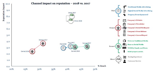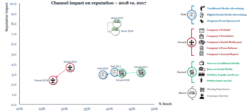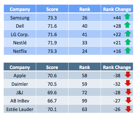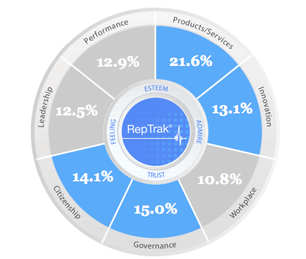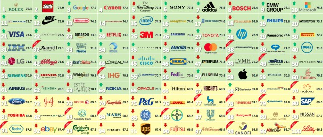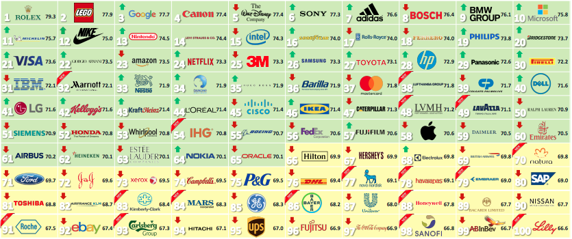 Desde 2006, Reputation Institute, una empresa de servicios de gestión y medición de la reputación, publica el Global RepTrak 100, un estudio anual de las empresas con mejor reputación del mundo. La clasificación de las empresas con mejor reputación del mundo de este año reveló una disminución promedio de 1,4 puntos en la reputación de las empresas RT100, la primera regresión significativa desde el final de la Gran Recesión.