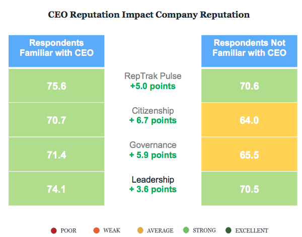 Entre los encuestados que están familiarizados con los CEO de las 100 empresas principales, la reputación de las empresas tiene un aumento de reputación de 5.0 puntos. Allí el valor de un CEO reconocido y con valores. El buen liderazgo está vinculado con la contribución de la sociedad y el gobierno ético y transparente.
