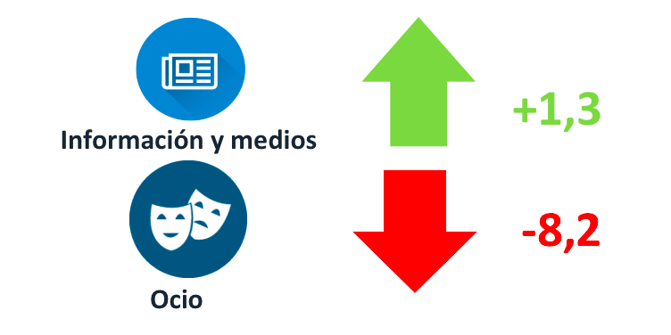 El sector más afectado ha sido el de ocio, que ha tenido una caída de 8.2 puntos respecto al año anterior. En contraste el sector de medios de información es el que ha tenido un mayor crecimiento (1.3 puntos) durante el mismo periodo.