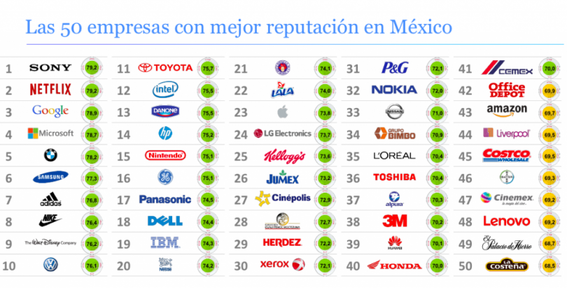 El estudio RepTrak México en su edición 2018 reveló que la tecnológica japonesa Sony es la empresa con mejor reputación según los consumidores mexicanos, mientras que en la segunda posición se encuentra Netflix, mientras que en el tercer puesto se ubica nada menos que Google.