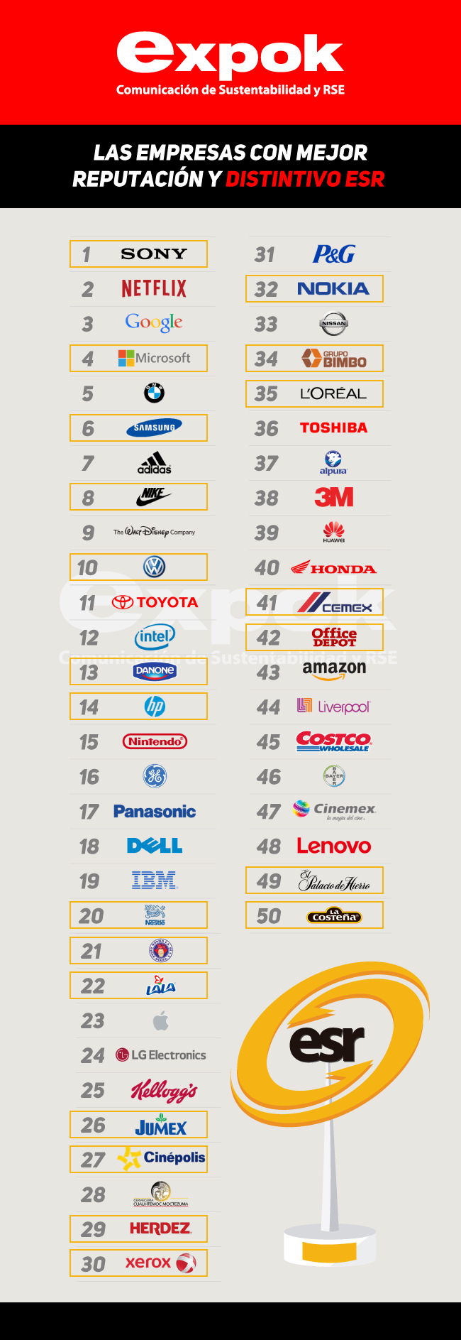 Si excluyéramos del ranking a todas aquellas compañías que no cuentan con el distintivo ESR otorgado por el Centro Mexicano de Filantropía, Sony todavía encabezaría el ranking, pero sería seguido de Microsoft y Samsung, ya que ni Netflix, ni Google, ni la automotriz BMW ostentan dicha distinción.