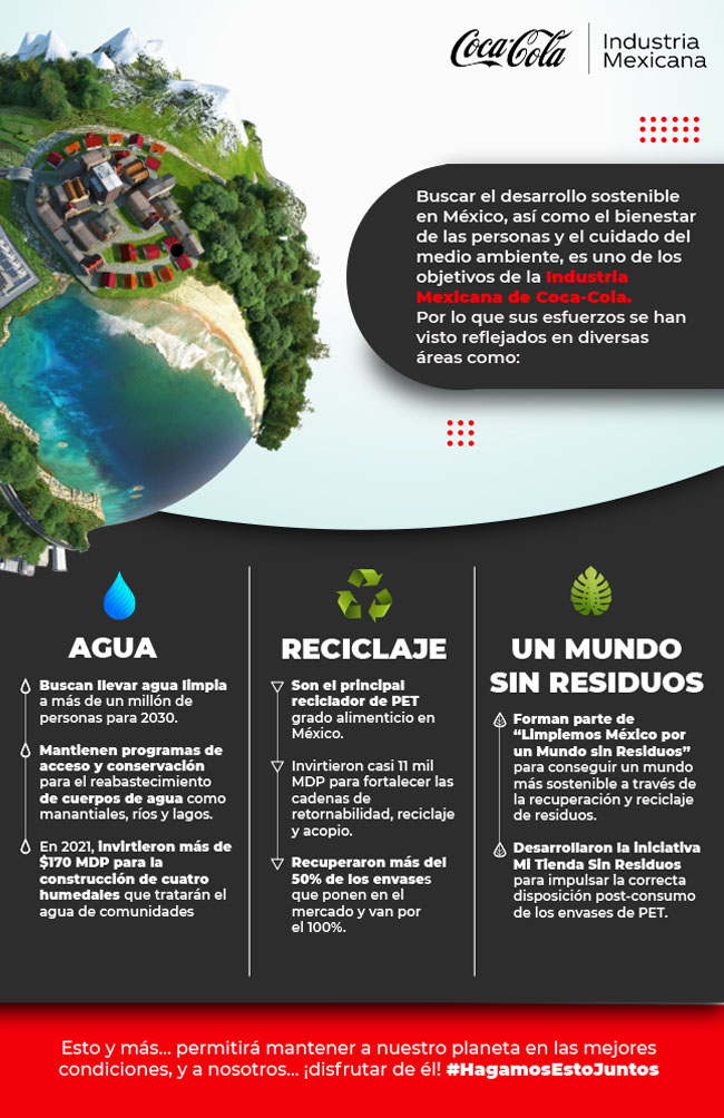 Desde su llegada a México, hace aproximadamente 95 años, la Industria Mexicana de Coca-Cola (IMCC) comparte con sus consumidores las preocupaciones por el medio ambiente, y busca el desarrollo sostenible del país en beneficio de las comunidades por medio de sus iniciativas socialmente responsables. Entre ellas se encuentran: