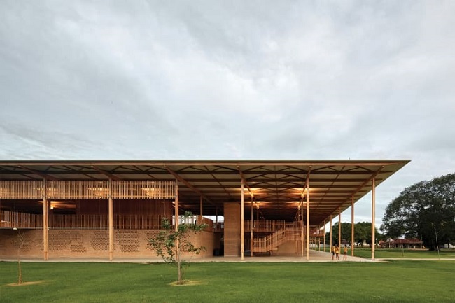 Las estructuras están hechas de bloques de tierra, lo que hace que los edificios sean rentables y sostenibles. Otros detalles incluyen techos de dosel enmarcados por madera laminada cruzada, que proporcionan alivio del clima tropical.