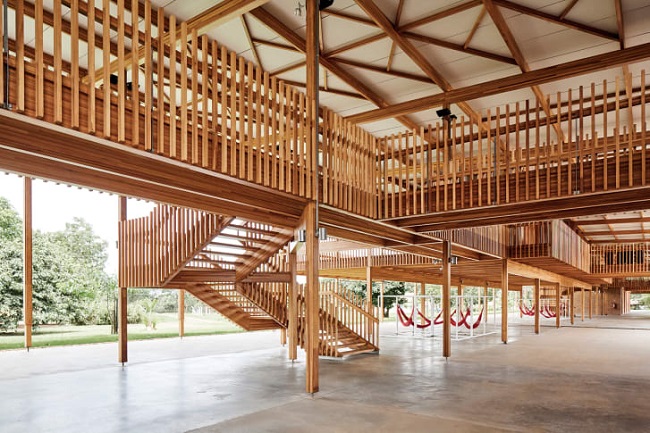 Las escaleras de madera conducen desde patios y dormitorios a áreas de juego, salas de lectura y televisión protegidas de los elementos por pantallas de madera ventiladas. También hay espacios para descansar en hamacas y pasillos superiores con vistas del campus de la escuela, con sus aulas establecidas, el refectorio y la clínica, y hacia un paisaje verde horizontal sin límites. Todo eso hace que sea el mejor edificio del mundo.
