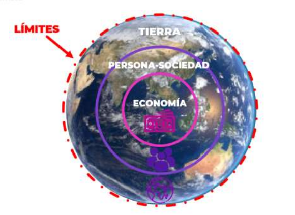 Fronteras Planetarias: No es la economía en el centro de las decisiones. Es entender la economía como una herramienta de desarrollo (no crecimiento) de las personas/sociedades, mismas que están contenidas por los límites de la tierra. Que la economía y toma de decisiones sea distributiva, regenerativa y justa.