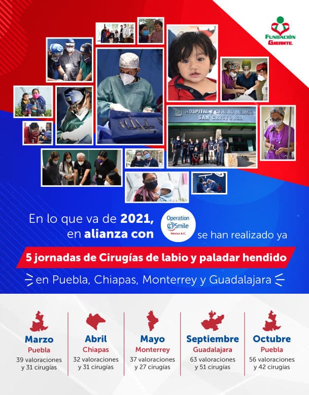 Esta es la labor que realiza en conjunto Operation Smile México —organización mexicana sin fines de lucro — y Fundación Gigante —brazo filantrópico de Grupo Gigante—. La alianza nació en 2011 con la finalidad de sumar esfuerzos para apoyar a la mayor cantidad de familias mexicanas que no tienen la posibilidad económica de costear una cirugía de este tipo.