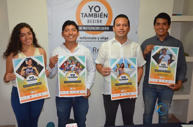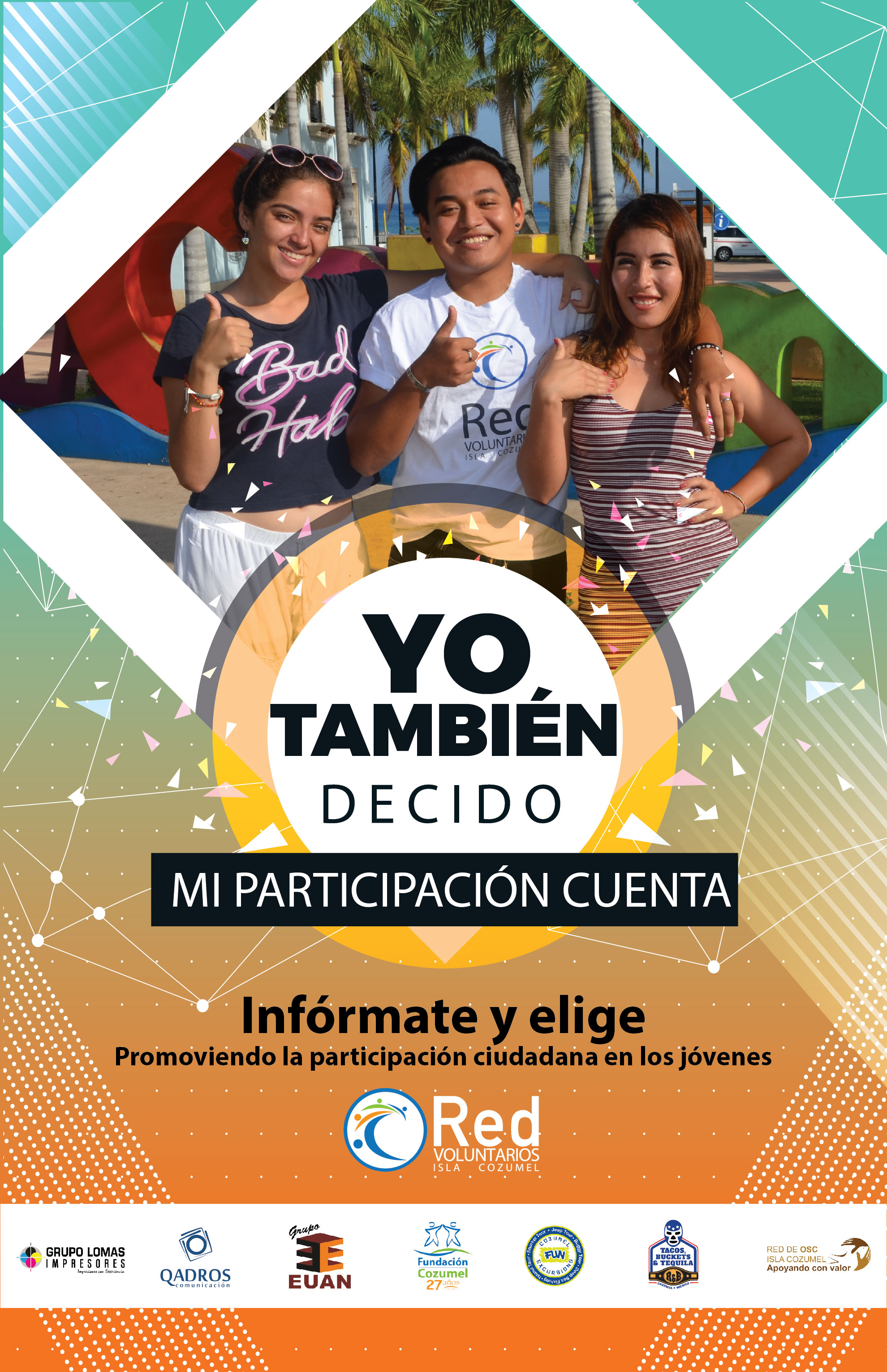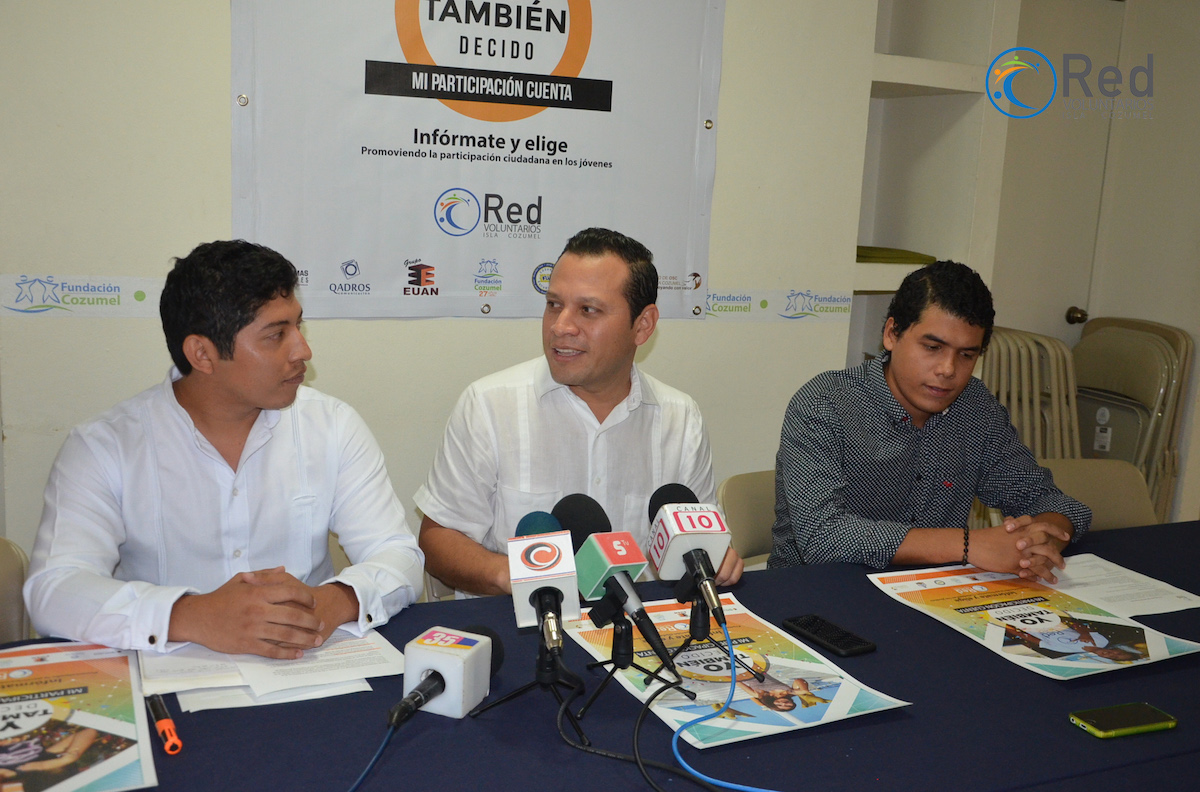 La Red de Voluntarios de Isla Cozumel presentó esta semana una campaña para promover la participación de los jóvenes este 1° de julio de 2018, se trata de “Yo También Decido, Mi Participación Cuenta” que se enfoca a jóvenes de 18 a 29 años. En la conferencia de medios estuvieron presentes Celia Hernández Alanís quien es la imagen principal de la campaña y Rodrigo Aranda Canella, un joven destacado que está decidido a apoyar la iniciativa. La campaña consta de 3 etapas: 1) Difusión de un video a través de redes sociales en donde se invita a los jóvenes a ejercer su derecho al voto, exponiendo que representan el 29 % del total de votantes en el país en el proceso electoral del 1 de julio de 2018 y cuyo reto es hacerlo viral a través de su fanpage Red de Voluntarios de Isla Cozumel; 2) Difusión de una convocatoria para que los jóvenes de Cozumel envíen propuestas en diversos temas relacionados con: educación, seguridad, empleo, salud, deporte, arte, emprendimiento, medio ambiente y participación ciudadana, con la finalidad de documentar las propuestas; y, 3) Entregar un documento con las propuestas de jóvenes de la comunidad a los candidatos a la presidencia municipal que expresen su voluntad por recibir el documento y tomarlas en cuenta durante su gestión, de favorecerles el voto. La campaña es apoyada por las organizaciones Fundación Cozumel y la Red de OSC de Isla Cozumel; y por empresas de la Isla quienes se suman a la causa social: Grupo Lomas Impresores, Grupo Euan, Qadros Comunicación, Tacos Bucket´s & Tequila y Cozumel Fun Excursions.