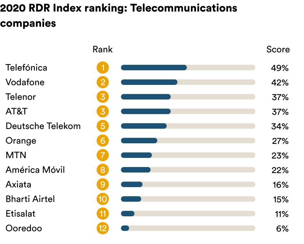 Para ello, clasifican a las empresas de telecomunicaciones, telefonía móvil e Internet más poderosas del mundo según los compromisos y políticas pertinentes, basados en los estándares internacionales de derechos humanos.