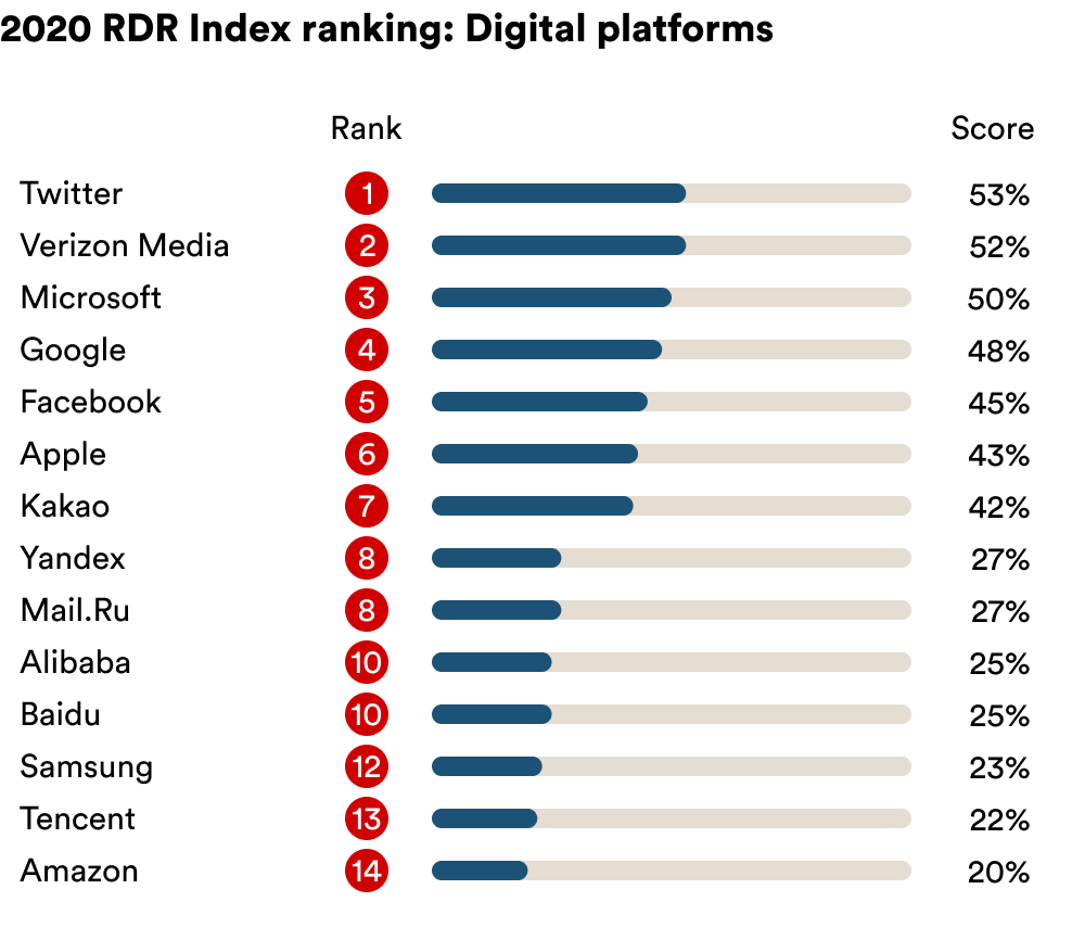 Y recientemente, Ranking Digital Rights (RDR) publicó el Índice de Responsabilidad Corporativa de los Derechos Digitales Ranking 2020 para confirmarlo.