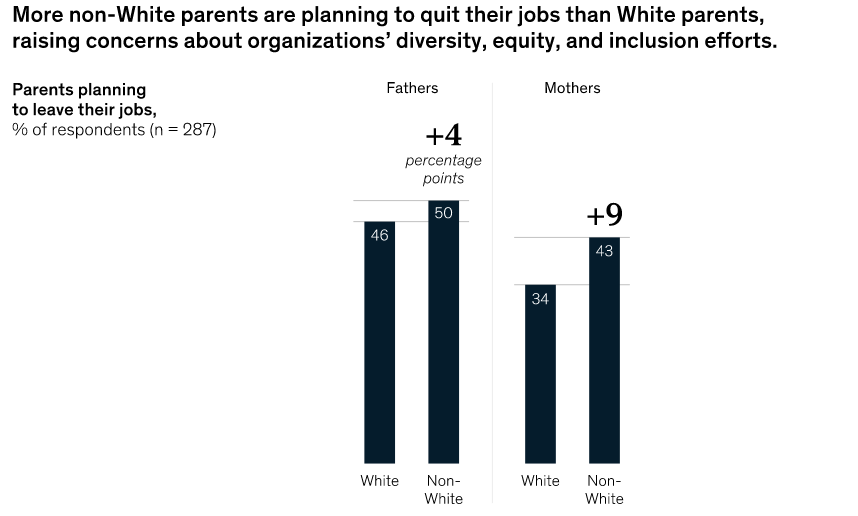 Asimismo, la encuesta de McKinsey reveló que de 20 razones posibles por las que dejarían su trabajo; las madres y padres señalaron el cuidado de la familia como una de las cinco razones principales. La investigación también arrojó datos sobre una creciente tendencia de modelo de trabajo remoto que favorecerían a las familias.