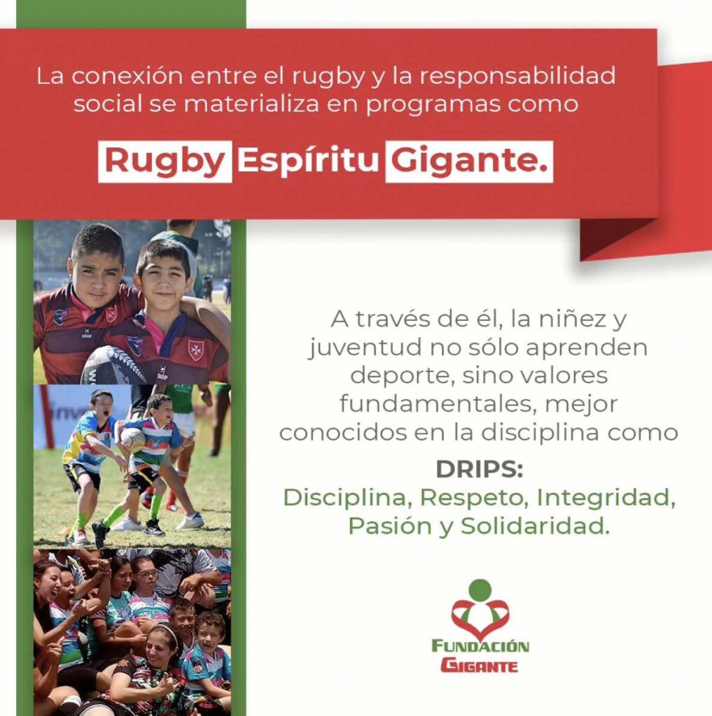 Es por ello que desde hace 9 años ha impulsado el programa Rugby Espíritu Gigante, una iniciativa generada por ex jugadores de rugby de origen francés y que, en alianza con dicha fundación empresarial, buscan promover valores llamados DRIPS (Disciplina, Respeto, Integridad, Pasión y Solidaridad) en niñas, niños y jóvenes, también alejarlos de las calles.