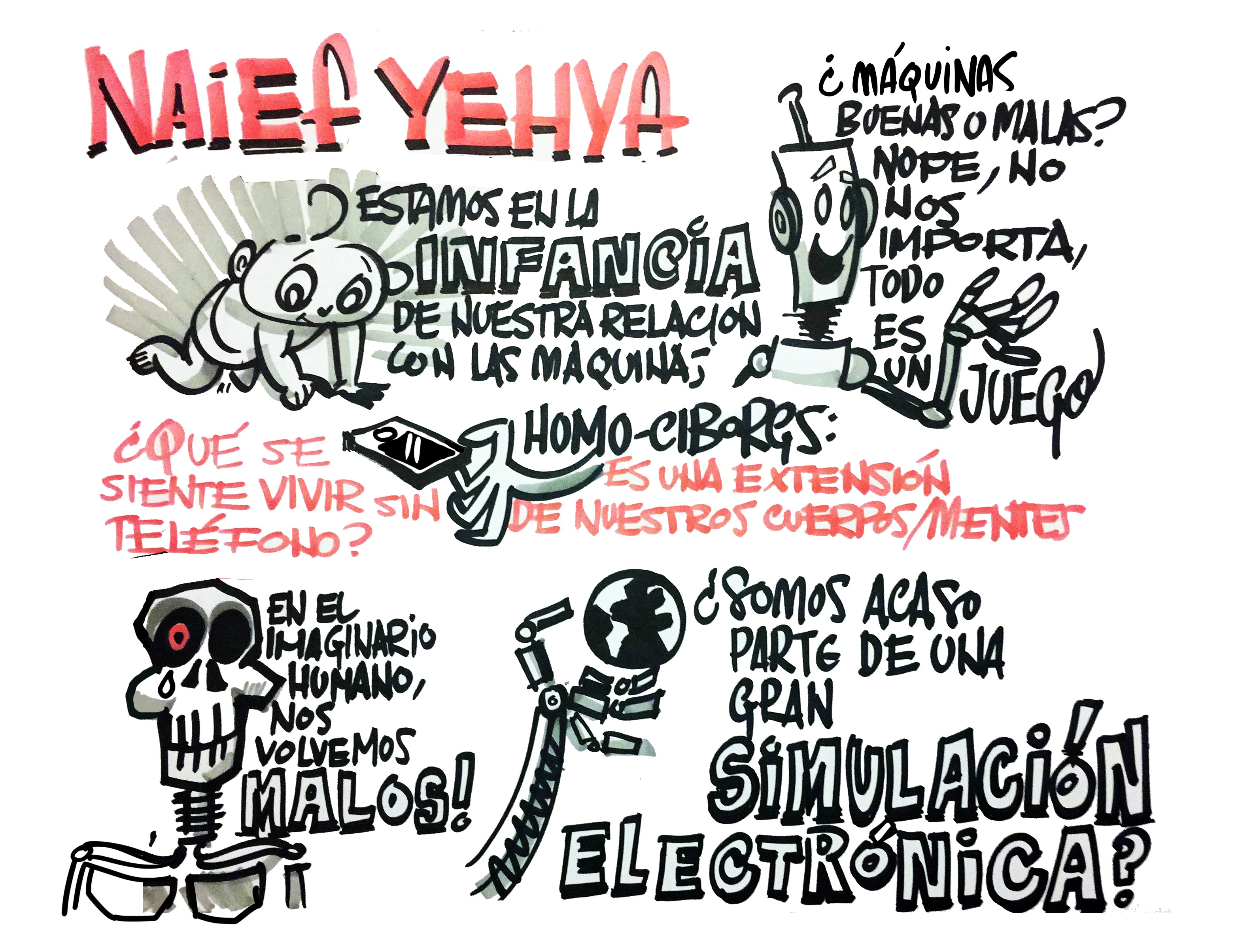 Naief Yehya, abordó el tema ¿máquinas buenas o malas?, desde la perspectiva que estamos en la infancia de nuestra relación con las máquinas, su reflexión la planteó a partir de qué, “las máquinas son indiferentes, cumplen objetivos específicos” y que es impensable, que la inteligencia nos derrotará. Nos invita a dejar un día el teléfono inteligente y a pensar en cómo las plataformas digitales nos enseñan a relacionarnos con ellas, menciona que es tan fácil como “un mayor número de likes, alimenta el ego”.