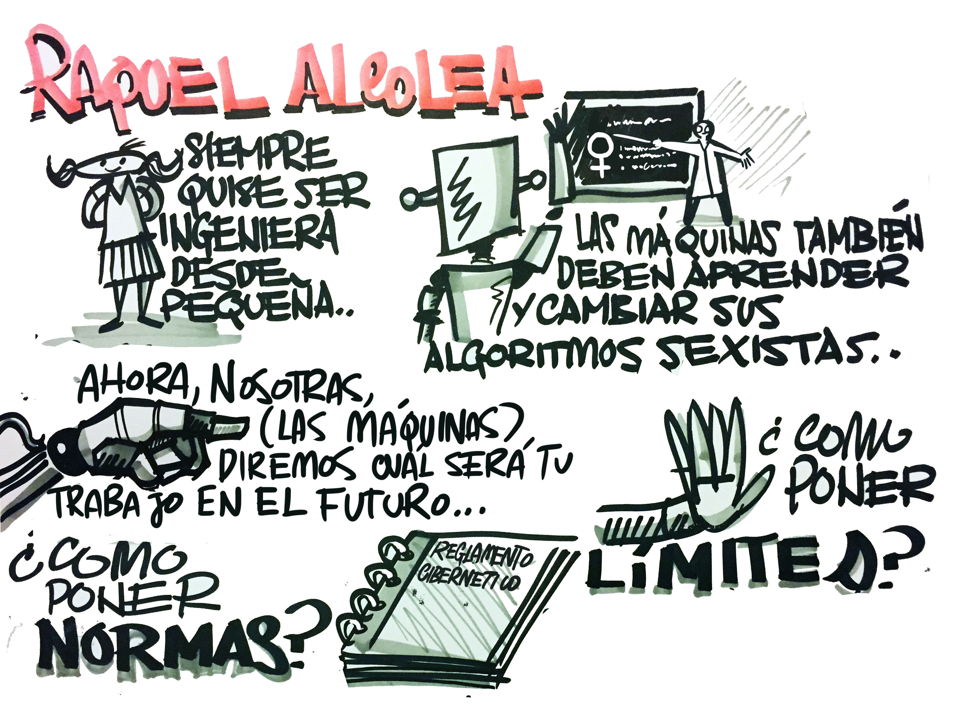 La participación de Raquel Alcolea, abordó el tema desde un punto de vista de equidad, sobre la disyuntiva de poner límites y normas. Invitó a usar las tecnologías en beneficio del ser humano, en el campo de la salud, en el diagnóstico, tratamiento de enfermedades. Hizo énfasis en que “tomemos todos conciencia para ir viendo como la Inteligencia Artificial, continúa evolucionando”.