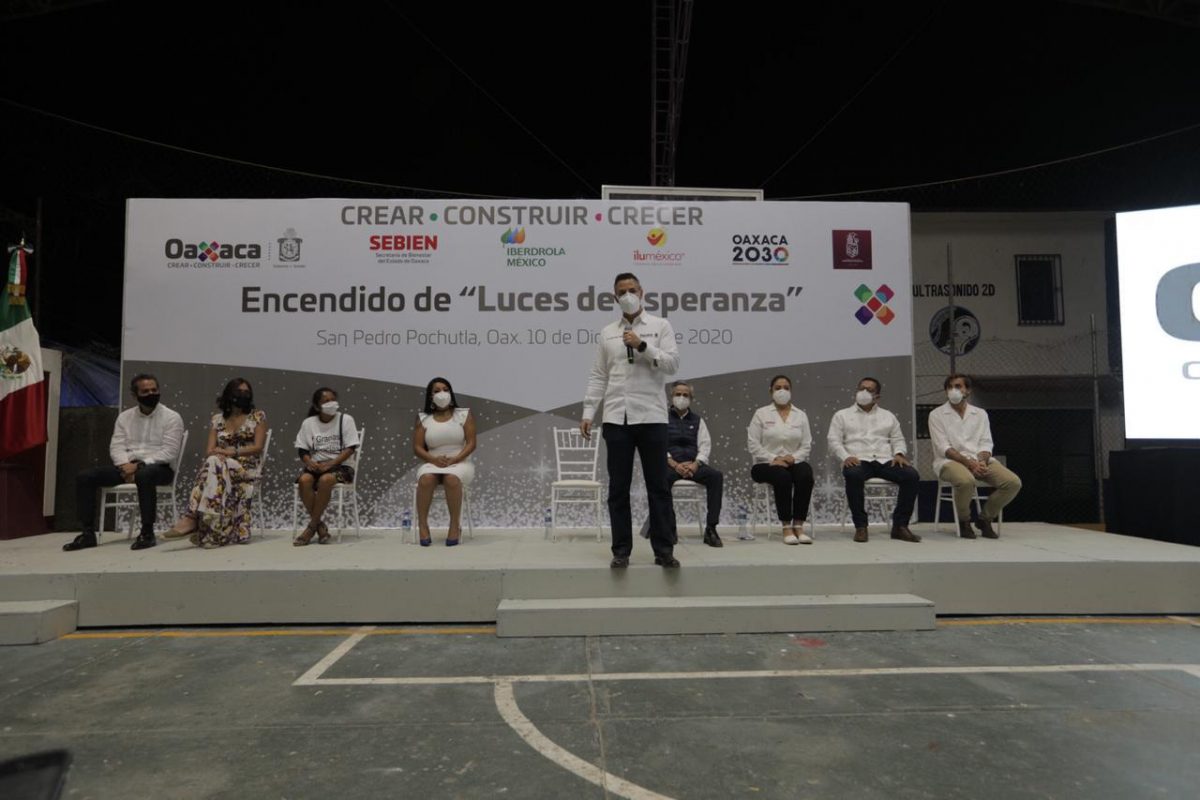 “Con el esfuerzo conjunto del sector gubernamental, del sector privado, así como de las y los ciudadanos pochutlecos, logramos un largo anhelo para 380 personas que, debido a las condiciones geográficas, se encuentran a más de 5 kilómetros de la luz eléctrica convencional y que por ello no habían tenido acceso a la energía eléctrica en sus viviendas”, mencionó el gobernador Alejandro Murat Hinojosa en el evento de encendido de las primeras 95 viviendas beneficiadas por Luces de Esperanza.