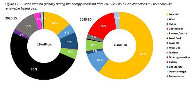 La transición energética global a un sistema eléctrico 100% renovable crea 36 millones de empleos para 2050 en comparación con 19 millones de empleos en el sistema eléctrico de 2015.