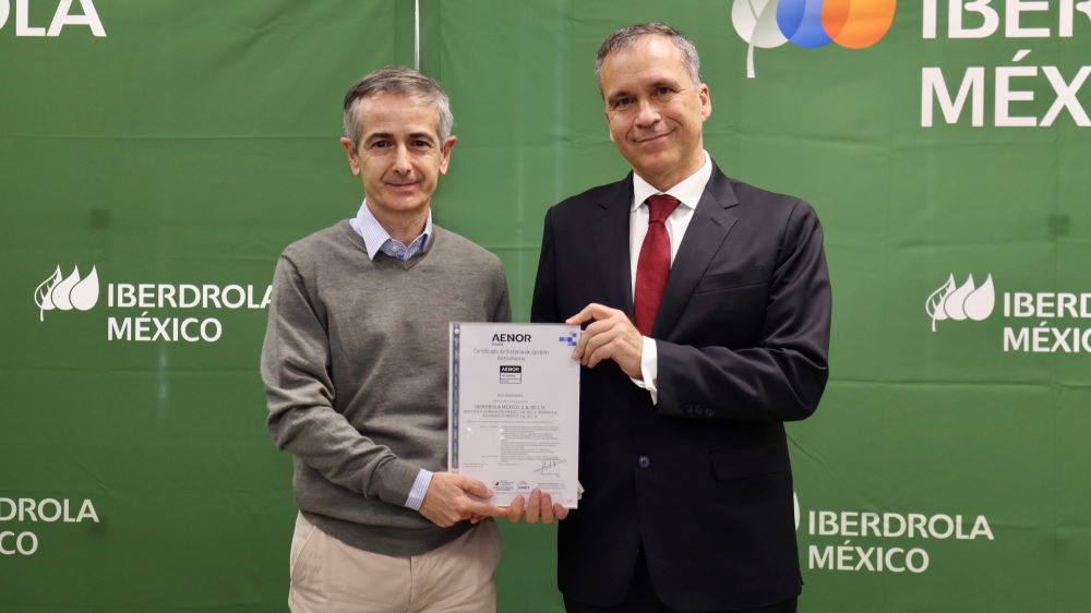 Iberdrola México cuenta con varios certificados otorgados por AENOR, entre ellos el ISO 14001:2015 de gestión ambiental para los diez parques renovables de la compañía en el país.
