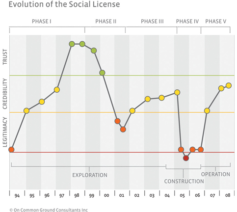 El siguiente gráfico proporciona una representación de la calidad de la licencia social para el Proyecto San Cristóbal en términos de percepciones de legitimidad y credibilidad de la comunidad y la presencia de confianza durante un período de catorce años desde 1994 hasta 2008.