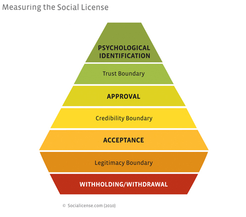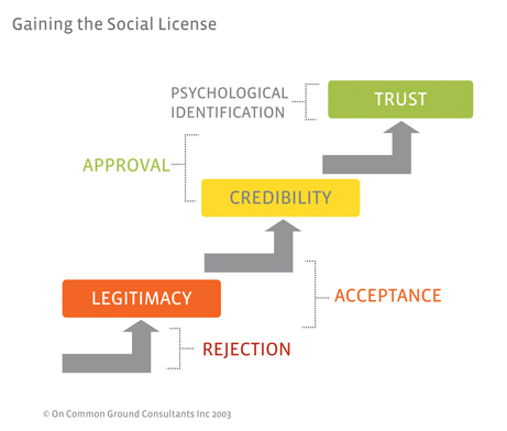 Estos elementos se adquieren secuencialmente y son acumulativos en la construcción hacia la licencia social. El proyecto debe considerarse legítimo antes de que la credibilidad sea valiosa y ambos deben estar en su lugar antes de que se pueda desarrollar una confianza significativa.