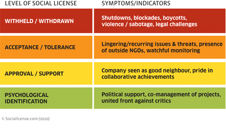 Más de quince años de investigación y experiencia han permitido reconocer que los componentes normativos de la licencia social comprenden las percepciones de la comunidad / las partes interesadas de la legitimidad y credibilidad social del proyecto, y la presencia o ausencia de verdadera confianza.