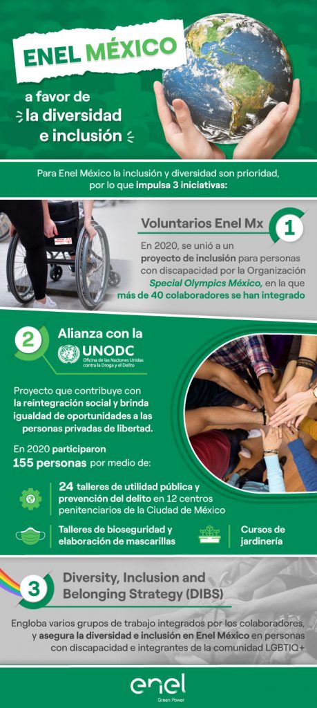 Enel México cuenta con una iniciativa de diversidad e inclusión para todas las personas dentro de la empresa, con la cual fomenta la satisfacción en el trabajo, transformación de la cultura, liderazgo, compromiso e innovación, entre los valores más importantes.