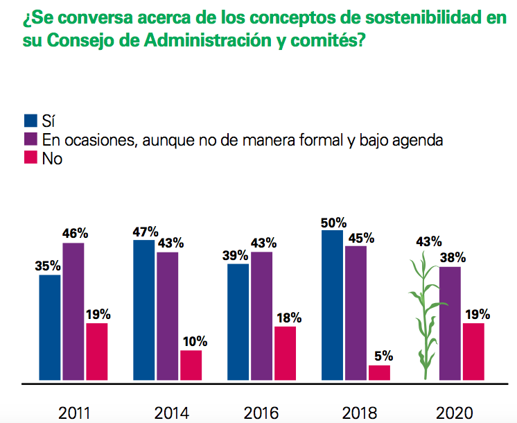 También disminuye la representación de compañías que reconocen tratar de manera no formal estas cuestiones en las sesiones de Consejo, con 38% de respuestas favorables frente a 45%.