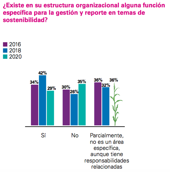 Esto se refleja en que 65% de las empresas cuentan con una función para asuntos de sostenibilidad, aunque la mayoría de estos puestos o funciones no sean específicos, sino que se encuentran dentro de otra área.