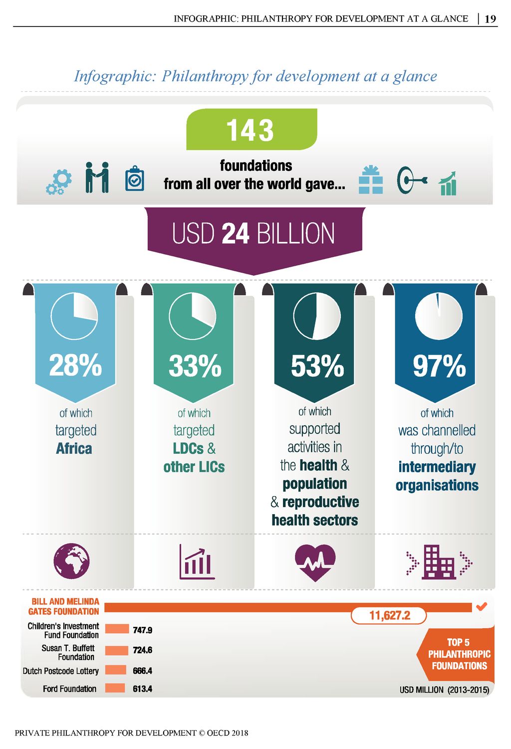 De las 143 fundaciones que están dentro de la encuesta publicada en el informe, la fundación Bill y Melinda Gates, fue la que más destacó por su filantropía, al contribuir con el 49% del apoyo al desarrollo.