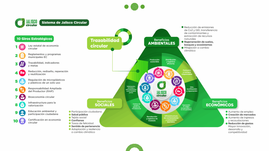 - Jalisco Circular se estructura en diez giros habilitadores, cada uno orientado a cerrar ciclos de materiales y promover la transición circular: