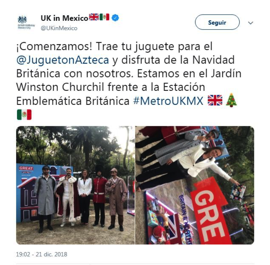 Para ayudar a cumplir el objetivo, el Reino Unido a través de su embajada en nuestro país ha realizado una colecta de Juguetes en el jardín Winston Churchil, mismos que serán entregados a Juguetón para que sean repartidos el 6 de enero.