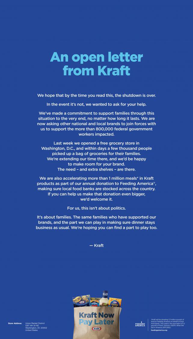 Según el portal AdAge, el 16 de enero de 2019, Kraft abrió una tienda de comestibles llamada Kraft Now Pay Later en Washington, DC, para dar a los empleados del gobierno un lugar para adquirir productos Kraft gratuitos.